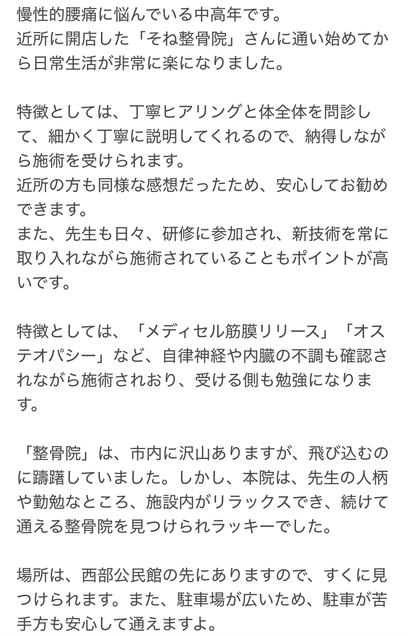 そんな中、先日当院「そね整骨院」に通われている患者様より、とても嬉しい口コミをいただきました。